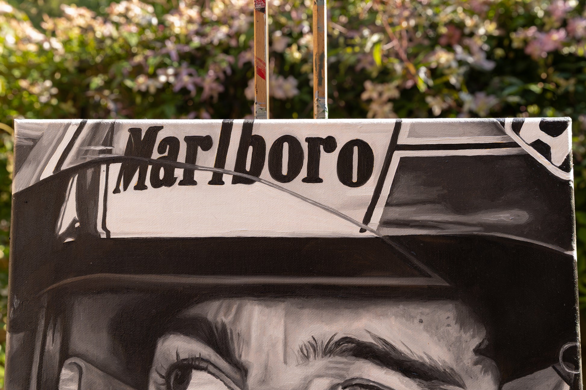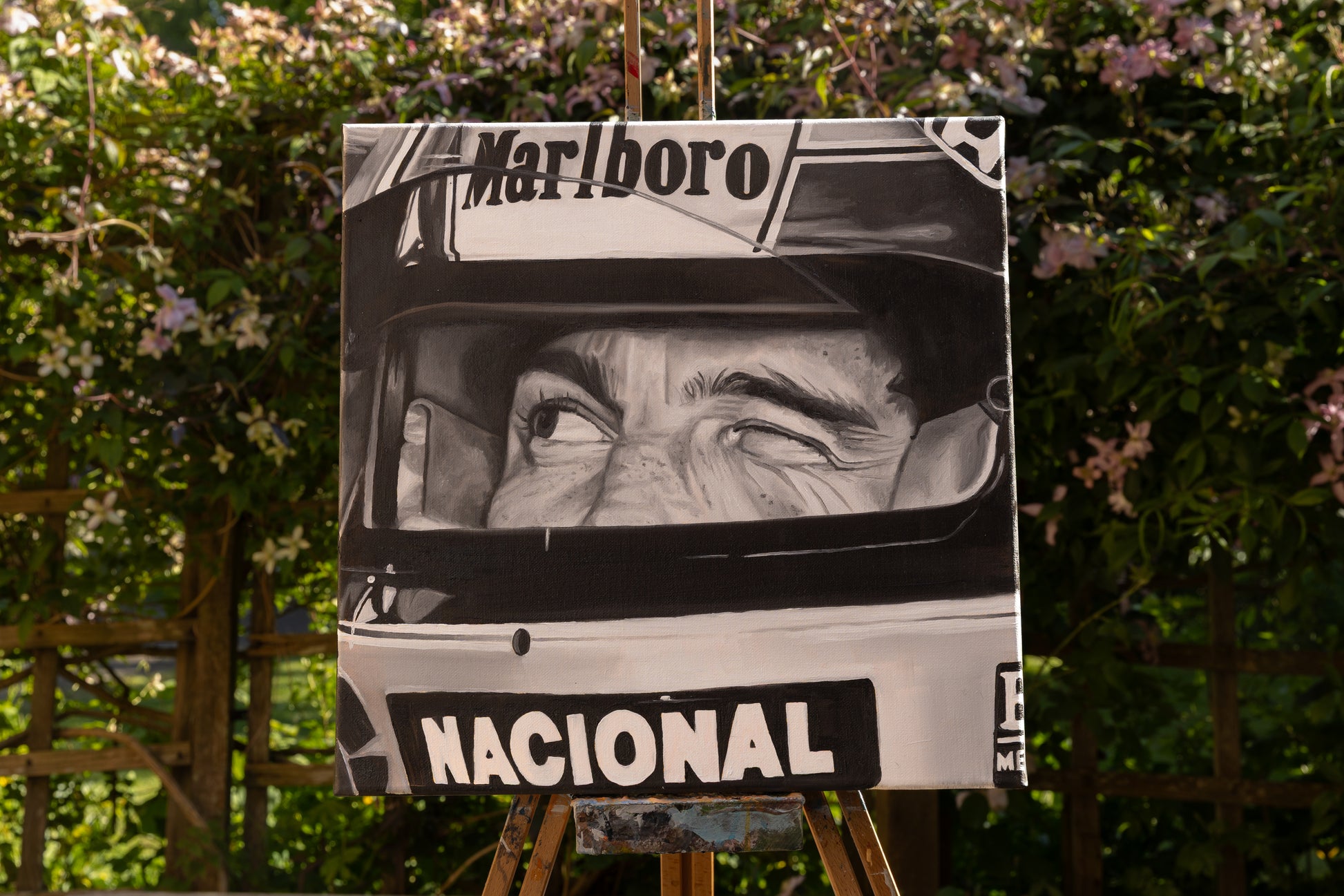 A black and white oil painting of Ayrton Senna’s eyes and helmet. Focused on expression and detail, this piece captures the intensity and presence he was known for. A quiet tribute to one of Formula 1’s most iconic drivers.